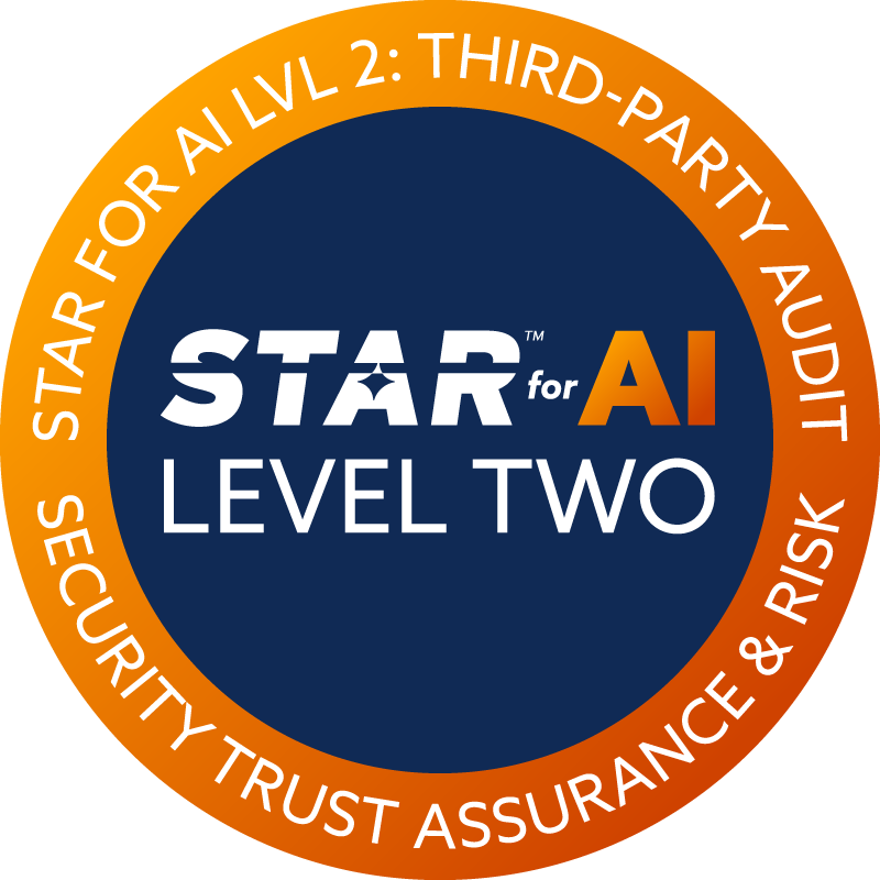 The advanced STAR for AI designation requires both a third-party ISO/IEC 42001 certification and a Valid-AI-ted AI-CAIQ. It demonstrates global AI compliance, safety, and operational transparency.